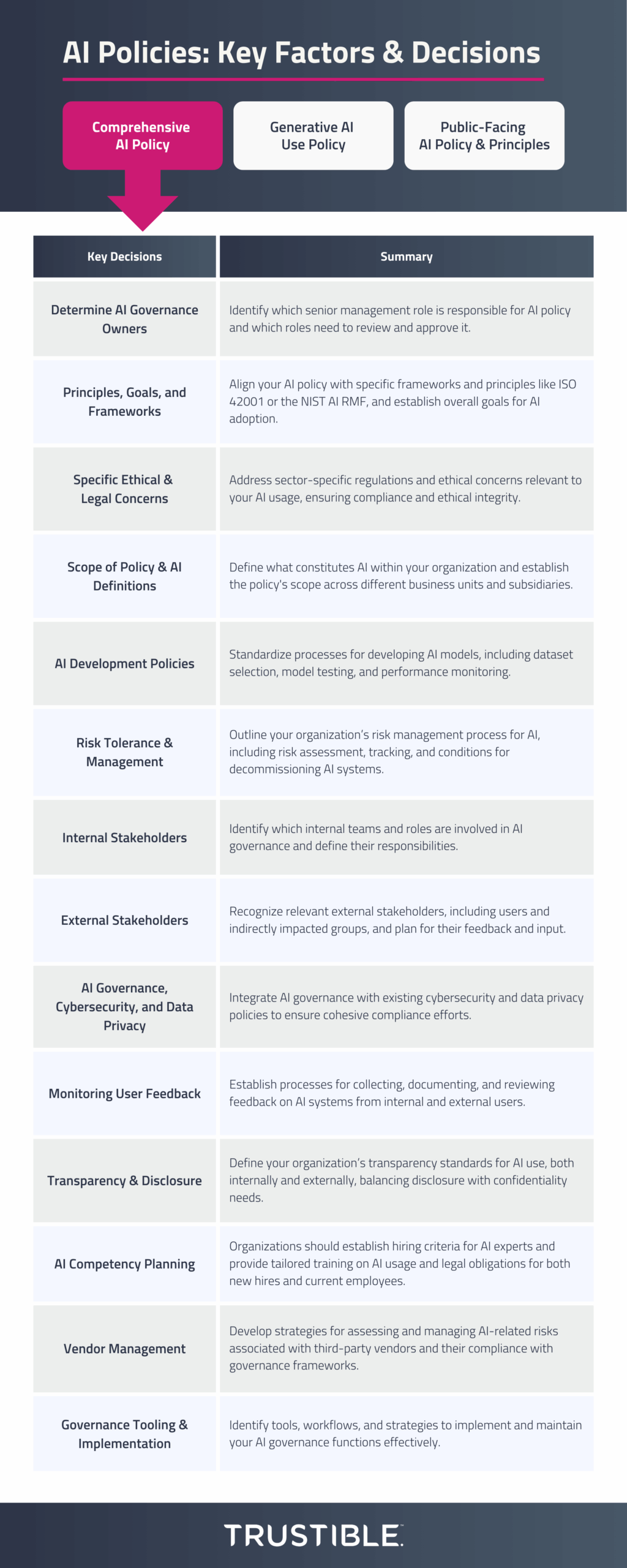 This blog post is the first in a series that explores the critical factors and decision points organizations must address when establishing their three AI policy categories outlined above. In this post, we take a deep dive into drafting a comprehensive AI policy, outlining 14 key considerations and discussing the tradeoffs you need to consider.