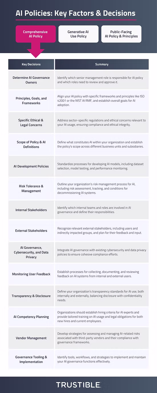 Let’s start with some important context. AI Policies break down into 3 categories: 1) Comprehensive organizational AI policy that includes organizational principles, roles and processes, 2) an ‘AI use’ policy that outlines what kinds of tools and use cases are allowed and what precautions employees must take, and 3) a public facing AI policy that outlines core ethical principles the organization takes and their stance on key AI policy stances. Some organizations maintain a separate policy regarding 3rd party AI use, although this may be a component of other policies, or simply reflected in vendor contracts. Each policy can serve a different purpose and the combination of all 3 ensures organizations are aligned against standards like ISO 42001 and the NIST AI Risk Management Framework.