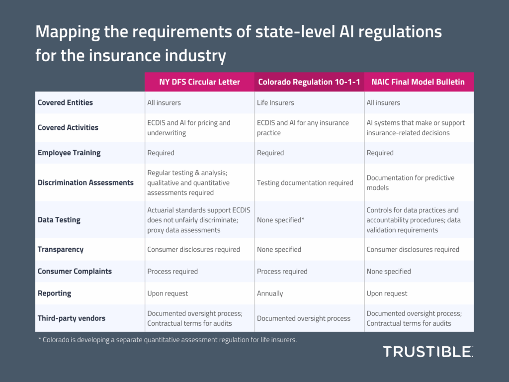 - Colorado Life Insurance Regulation (September 2023): Requires life insurers using external consumer data and information sources (ECDIS) to establish risk management programs that prevent unfair discrimination. Insurers must submit compliance reports to the Colorado Division of Insurance.
