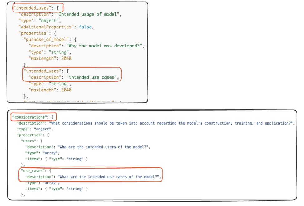 The previous example is fairly simple, but the actual content is, also, different across examples and toolkits. For example, the “computational resources” and “environmental impact” of model training are only present in the HuggingFace Model Card tool. This field may not be useful when using a simple model or a pre-trained model, but having it represented in the schema can be important. For example, the EU AI Act Annex IV requires reporting “the computational resources used to develop, train, test and validate the AI system”. If the computational_resources field was in the JSON Schema, model developers would know where to put this information, and compliance teams would be able to gather this information reliably.