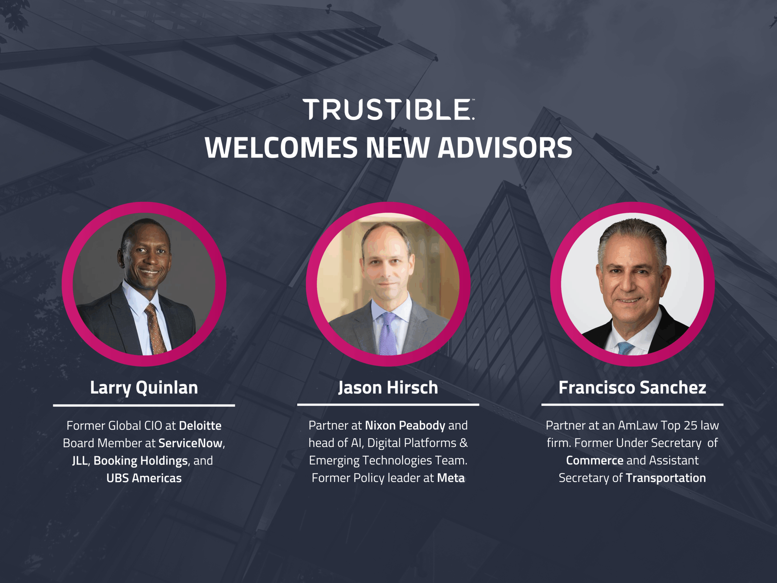 We are thrilled to announce the addition of three new members to the Trustible Advisory Board: Larry Quinlan, Jason D. Hirsch, and Francisco Sánchez. Their deep expertise in AI, enterprise technology, regulatory strategy, and product counseling will guide Trustible customers and leadership on global challenges at the intersection of technology, law, and government policy.