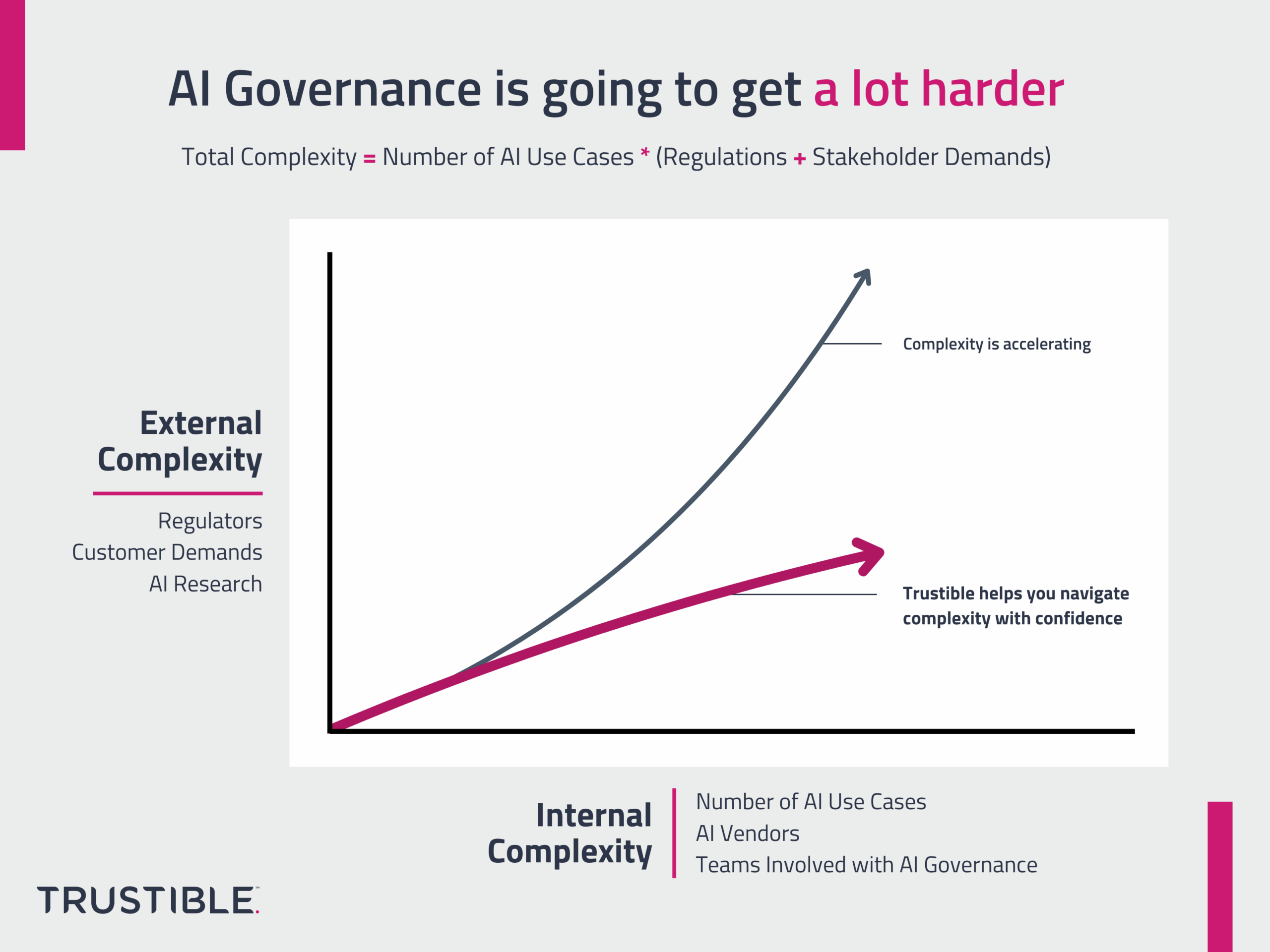 The key challenge with AI governance is that the internal and external complexities will get multiplied together. For every new AI product feature, there may be a growing set of regulatory requirements. Similarly, for every newly discovered AI vulnerability, there may be dozens of internal tools affected by it that need to be updated. Teams may be well equipped to navigate the growing internal complexity, but the uncertain and rapid growth of the external complexity is something many businesses are unprepared for.
