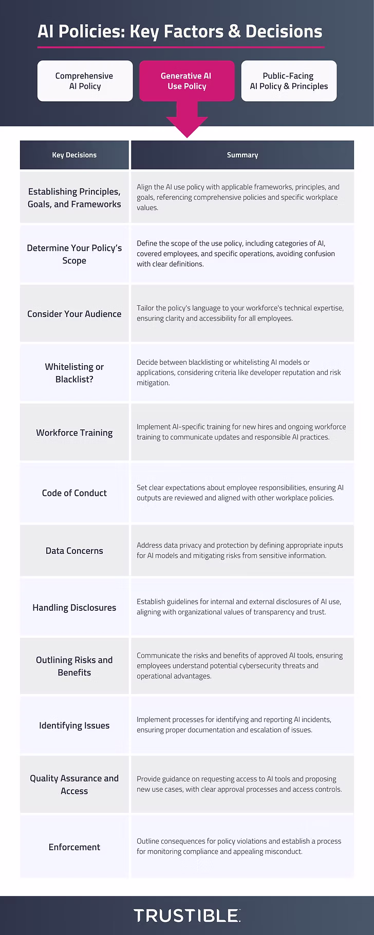 In this series’ first blog post, we broke down AI policies into 3 categories: 1) a comprehensive organizational AI policy that includes organizational principles, roles and processes, 2) an AI use policy that outlines what kinds of tools and use cases are allowed, as well as what precautions employees must take when using them, and 3) a public facing AI policy that outlines core ethical principles the organization adopts, as well as their stance on key AI policy stances. In this second blog post on AI policies, we want to explore critical decisions and factors that organizations should consider as they draft their AI use policy.