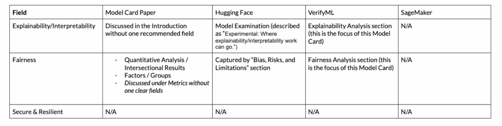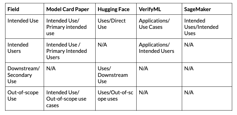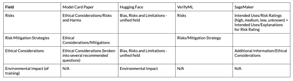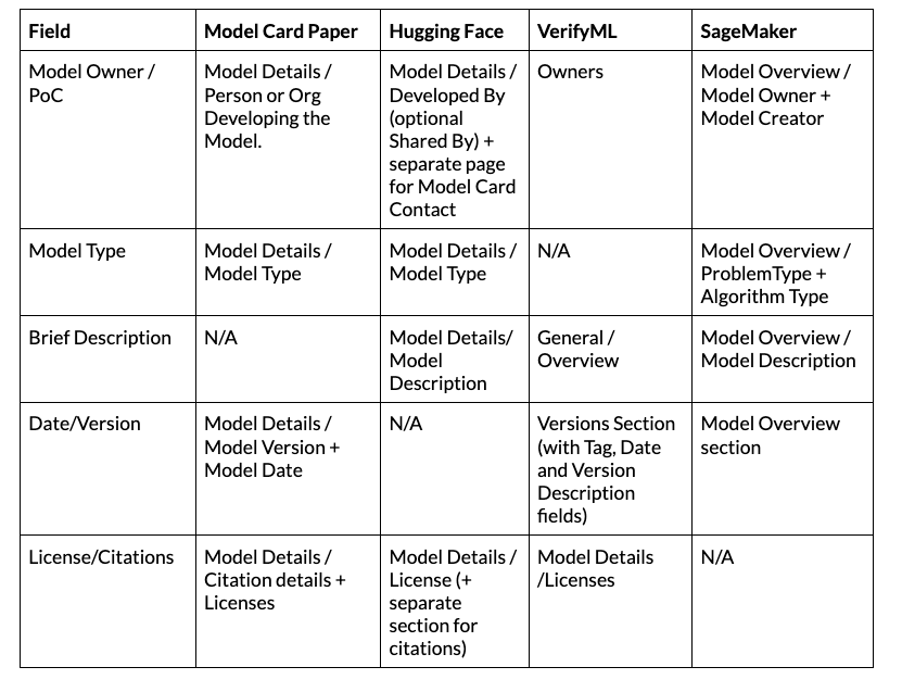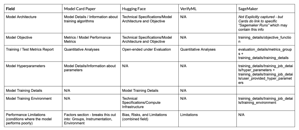 For this comparison we will compare fields from the Model Card Paper, Hugging Face Card Creator, AWS Sagemaker and VerifyML. In most cases, we will document a super-set of relevant fields. From a regulatory perspective, we will be referencing the NIST RMF Playbook.